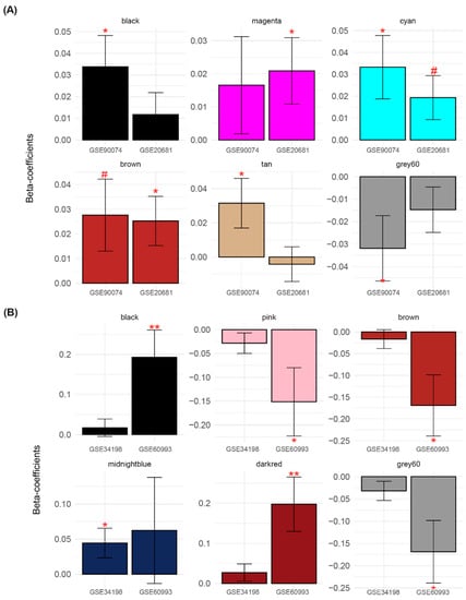 Selection of obstructive CAD- and ACS-related modules based on differential expression analysis. Beta-coefficients were measured from linear regression by setting MEs (A) and disease status (B) (i.e., obstructive CAD and ACS vs. matched control) as dependent and independent variables, respectively. **, *, # denote p < 0.01, p < 0.05, and p < 0.1, respectively. ME, module eigengene; CAD, coronary artery disease; ACS, acute coronary syndrome.
