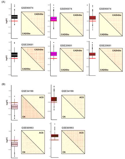 Selection of CAD obstruction (A) and ACS-related (B) modules based on differential co-expression analysis. Fold change (FC) values (logFC) between two conditions were calculated using the limma package. Adjacency matrices are described as six matrix plots. A matrix plot consists of two conditions: disease status including CAD obstruction and ACS is the upper triangular matrix, and matched control status is the lower triangular matrix. Abbreviations: FC, fold change; CAD, coronary artery disease; CADhSte, CAD with high stenosis; CADlSte, CAD with low stenosis; ACS, acute coronary syndrome; CN, matched control.