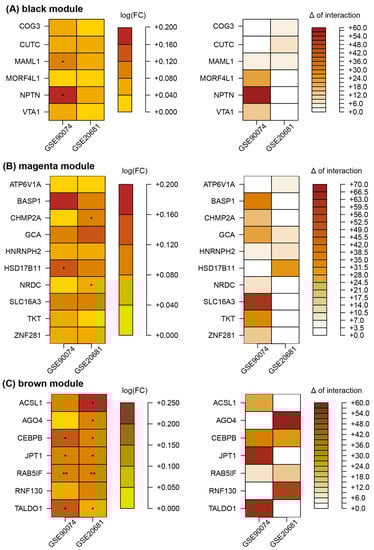 Representative obstructive CAD-related genes in the black (A), magenta (B), and brown (C) modules. FC values (logFC) between two conditions were calculated using the limma package. Delta (Δ) of interaction indicates the difference between the number of interactions in CVD and matched control groups. **, and * denote p < 0.01, and p < 0.05, respectively. Abbreviations: CAD, coronary artery disease; FC, fold change.