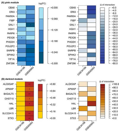 Representative ACS-related genes in the pink (A) and dark-red (B) modules. FC values (logFC) between two conditions were calculated using the limma package. Delta (Δ) of interaction indicates the difference between the number of interactions in ACS and matched control groups. **, and * denote p < 0.01, and p < 0.05, respectively. Abbreviations: CAD, coronary artery disease; FC, fold change.