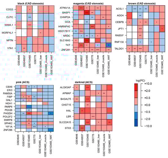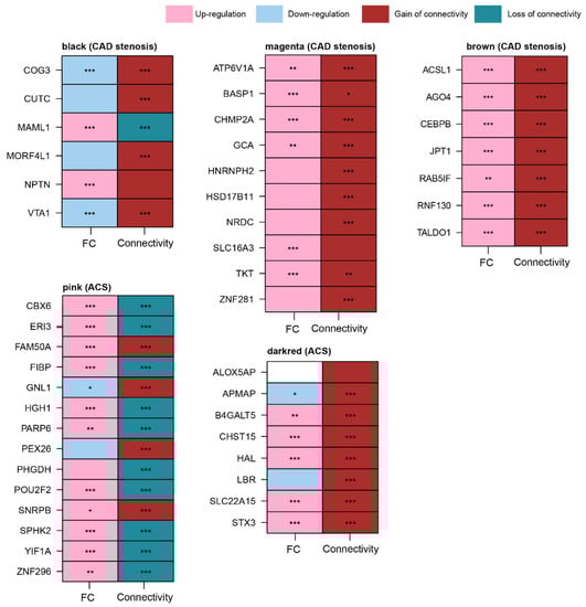 Replication analyses from independent human blood CVD datasets for genes in five modules (black, magenta, brown, pink, and dark red). FC values (logFC) between two conditions were calculated using the limma package. Connectivity was measured based on biweight midcorrelation. In logFC columns, ***, **, and * denote p.adj < 0.001, p.adj < 0.01, and p.adj < 0.05, respectively, and these values were measured by the limma method. In connectivity columns, ***, **, and * denote p < 0.001, p < 0.01, and p < 0.05, respectively, and these values were measured by paired t-test between ACS and matched CN correlation matrices. Abbreviations: CVD, cardiovascular disease; CAD, coronary artery disease; ACS, acute coronary syndrome; FC, fold change; p.adj, p-value adjusted by false discovery rate.