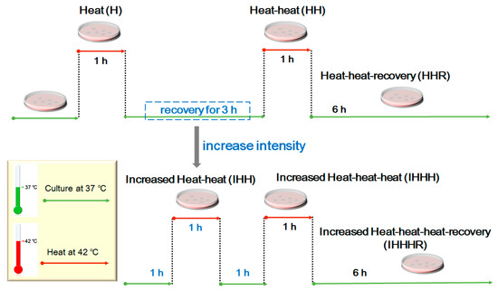 To increase the stimulation intensity, short recovery time of 1 h between heat-shocks was adapted. As shown in Figure 1, the H cells were sequentially treated with recovery for 1 h, heat-shock for 1 h (denoted as “increased heat-heat, IHH”), recovery for 1 h, another heat-shock for 1 h (denoted as “increased heat-heat-heat, IHHH”), recovery for another 6 h (denoted as “increased heat-heat-heat-recovery, IHHHR”).
