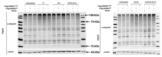 To further investigate the contribution of aggresomes and autophagosomes to the clearance of misfolded proteins, we tested the content of ubiquitinated proteins in untreated and heat-shocked HEK293T cells. As shown in Figure 6, a significant increase in protein ubiquitination was detected in heat-shocked cells. In “HH” group cells, ubiquitinated proteins decreased after recovery, indicating that the recovery time of 6 h is sufficient for cells to clear these proteins. For cells treated with increased heat shock (IHHH), recovery time longer than 6 h is required for cells to degrade stress-induced ubiquitinated proteins. For both “HH” and “IHHH” group cells, however, HSPB1S135F obviously prevented the clearance of heat-induced ubiquitinated proteins when compared with HSPB1WT, especially for the proteins with high molecular weight. This confirmed the negative effect of HSPBS135F in the turnover of misfolded proteins caused by repeated stress.