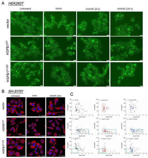 To explore whether the defect in the clearance of misfolded proteins in HSPB1S135F-overexpressing cells affects cell recovery from repeated heat shock, cell survival state and morphologies were further analyzed. An inverted phase-contrast microscope can be employed to observe cell survival state [31]. As shown in Figure 5A, HSPB1S135F increased the amount of apoptotic HEK293T cells in recovery groups, confirming the cytotoxicity of misfolded proteins demonstrated in the previous study [22]. Herein, the cell area and aspect ratio of SH-SY5Y cells were measured for cell state analysis (Figure 7B,C). Obvious heat-induced morphological changes were observed for HSPB1WT and HSPB1S135F-expressing cells, as manifested by a reduction in aspect ratio and cell area, respectively. After cell recovery of 24 h, most of the HSPB1WT-expressing cells can return to their original aspect ratio (indicated by blue boxes in Figure 7C). In contrast, most HSPB1S135F-expressing cells sustained the state of heat-induced poor cell spreading (indicated by green boxes in Figure 7C), indicating their failure in recovery from repeated stress. These results clearly demonstrated that HSPB1S135F has a deleterious effect on cell recovery from repeated stress.