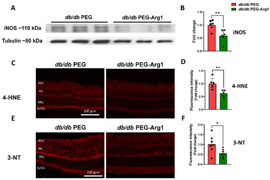 3.4. PEG-Arg1 Treatment Decreases iNOS Expression and Oxidative/Nitrative Stress in db/db Retinas