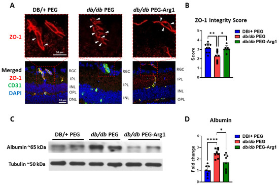 3.7. PEG-Arg1 Treatment Restores the Blood–Retinal Barrier (BRB) in db/db Mice