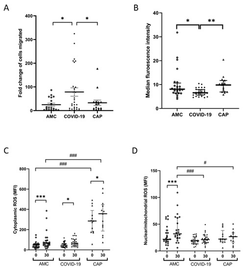 Cytoplasmic (c)ROS, and nuclear/mitochondrial (n/m)ROS were measured in resting neutrophils and following phagocytosis. Compared to unstimulated cells, cROS levels were elevated after phagocytosis in both AMC (MFI: 46.8 (28) baseline vs. 64.9 (51) 30 min, p = 0.0091), and CAP patients (MFI: 285 (211) baseline vs. 357 (260) 30 min, p = 0.038), but not in COVID-19 patients (MFI: 44.1 (35) baseline vs. 65.3 (60) 30 min, p = 0.134, Figure 2C). CAP patients had significantly higher cROS at baseline, and after 30 min phagocytosis compared to both AMC and COVID-19 patients (p < 0.0001, Figure 2C).