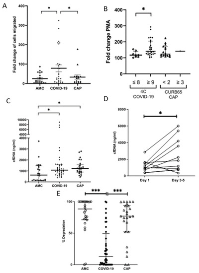 NETosis in COVID-19. (A) NET release by neutrophils stimulated with PMA for 3 h, measured as the absorbance of cfDNA stained with Sytox green. Data shows a fold change in absorbance of PMA stimulated neutrophils compared to vehicle control. * p = 0.0394 AMC (n = 26) vs. COVID-19 (n = 33), CAP (n = 17). (B) Comparison of NET release by activated neutrophils in patients with low 4C (n = 8) or high 4C (n = 26) score, * p = 0.0118. There was no difference between CAP patients differentiated by curb65 score. (C) Plasma cell free DNA levels measured by fluorometry in AMC * p = 0.0396 AMC (n = 23) vs. COVID-19 (n = 39), * p = 0.0322 AMC vs. CAP (n = 26). (D) Comparison of cfDNA levels measured by fluorometry in COVID-19 (n = 10) on day one and on days three to five. * p = 0.0186. (E) % DNA degradation by serum NETs. *** p < 0.0001 AMC (n = 24) vs. COVID-19 (n = 40), *** p = 0.0001 AMC vs. CAP (n = 26).