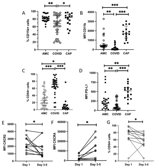 On day three to five follow-up, relative to baseline readings, there was a decrease in CXCR2 expression: (MFI: 1960 (1601) day 1 vs. 1126 (1262), day three to five, p = 0.0322, Figure 4E) and a significant increase in CXCR4 expression: (MFI: 1785 (3951) day one vs. 10,248 (16,483), day three to five, p = 0.0273, Figure 4F). The percentage of cells expressing CD54 was significantly reduced at three to five day follow up: (80.6% (34.6) Day one vs. 58.9% (38.3), day three to five, p = 0.0420, Figure 4G).