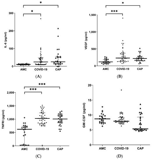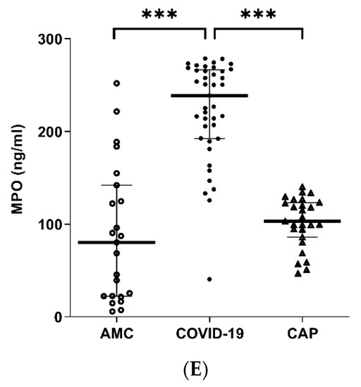 Compared to AMC, both COVID-19 and CAP patients showed elevated levels of IL-6 (COVID-19 p = 0.0296, CAP p = 0.0106, Figure 5A), VEGF (COVID-19 p < 0.0001, CAP p = 0.0032, Figure 5B), and sTNFRI (COVID-19 p < 0.0001, CAP p < 0.0001, Figure 5C). Compared to AMC, only COVID-19 patients showed elevated MPO (p < 0.0001, Figure 5D). No difference in levels of GM-CSF (Figure 5E) were observed.