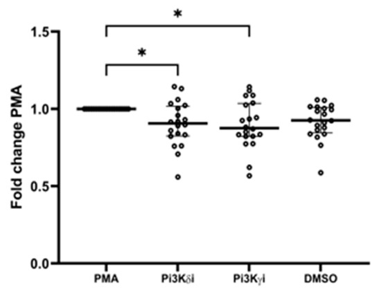 PI3K inhibition. COVID-19 neutrophils were pre-incubated for 30 min with PI3Kσ inhibitor CAL101 and PI3Kγ inhibitor AS252434, and NET release measured in response to PMA stimulation. Data shows fold change in absorbance of PMA stimulated neutrophils compared to PMA control, n = 18. * p = 0.0129 PMA vs. PI3KσI, * p = 0.0156 PMA vs. PI3KγI.