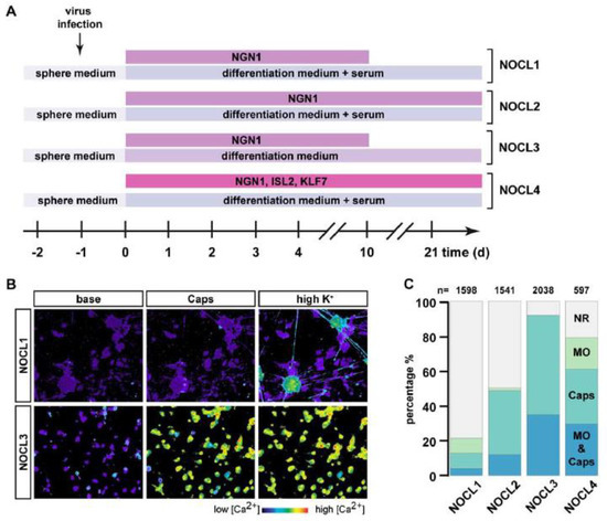 During mouse DRG development, NGN1 is transiently expressed. However, it is unclear at what time point during human DRG development NGN1 is turned on and for how long its expression persists. We therefore compared conditions of transient and extended NGN1 expression, designated NOCL1 and NOCL2, respectively (Figure 2A). Additionally, external factors such as neurotrophins have been shown to influence sensory neuron fate. We therefore included a culturing condition devoid of serum; instead, we used a defined medium only containing neurotrophins implicated in sensory neuron differentiation (NOCL3—Figure 1A and Figure 2A; see methods for details). Last but not least, we also modified a previously published differentiation protocol and included two additional transcription factors KLF7 and ISL2—instead of NGN1 alone—which had been shown to induce nociceptor-like cells [5]. Different to the previous protocol, which uses human fibroblasts or embryonic stem cells as starting cell population, we introduced these factors into derived NCLCs, based on the assumption that the native precursors of nociceptors are more readily primed to differentiate into sensory neurons. We refer to this differentiation procedure as NOCL4 (Figure 2A). Next to te TRKA expression, a hallmark of many nociceptors is the expression of the capsaicin receptor TRPV1 [1]. Thus, a common way to identify and characterize nociceptors is to test their response to capsaicin, the pungent ingredient of chili peppers that triggers the opening of the TRPV1 ion channel to permit cation permeation such as the influx of calcium ions. Accordingly, following a differentiation period of at least 3 weeks, we evaluated the differently generated NOCLs for their ability to respond to capsaicin. NOCL cultures were loaded with the calcium indicator Fura-2 and challenged by 1 μM capsaicin. Remarkably, we found that the NOCL cultures differed considerably in their response to Capsaicin: while only 13 ± 2% of neurons responded to capsaicin when NGN1 was turned off after 10 days (NOCL1 differentiation protocol; Figure 2B,C), expressing NGN1 constitutively for the entire differentiation period resulted in 48.9 ± 7.6% of capsaicin responders (Figure 2C).