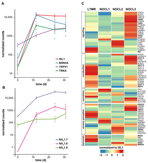(A) RNA–seq analysis of ISL1, BRN3A, TRPV1 and TRKA transcripts in NOCL3 cells at specific time points during their differentiation (0, 12, 24 and 31 d), shown as normalized counts (for analysing details see material and methods; n = 3). (B) RNA–seq analysis of NAV1.7, NAV1.8 and NAV1.9 transcripts in NOCL3 cells at specific time points (0, 12, 24 and 31 d) during their differentiation, shown as normalized counts (n = 3). (C) Heatmap showing the relative expression of selected genes in LTMR and NOCL1–3 cells after 24 days of differentiation. Genes are categorized into functionally connected groups, and those indicated in bold have been analysed in more detail (neurotrans. = neurotransmission, transcript. = transcription). Gene counts were first normalized and then related to the pan–sensory marker ISL1 and averaged (n = 3). Depicted are center–scaled values.