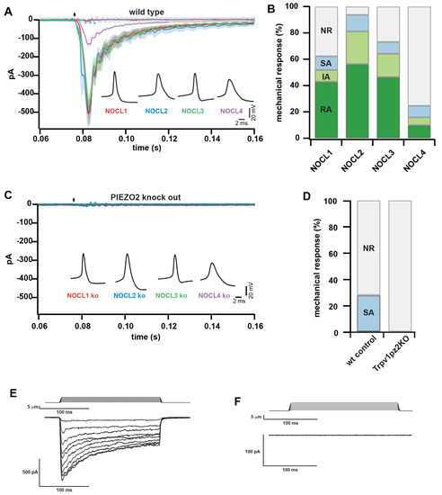 In agreement with the expression of PIEZO2 in native murine and human nociceptors [15,34,56,57,58] and with the expression of robust RNA of the mechanotransducer PIEZO2, all four different NOCL neuron types (Figure 3C and Figure 4C) resemble different subtypes of human nociceptors. These data suggest that PIEZO2 can act as a mechanotransducer in human-derived nociceptors when membrane intendation of cultured neurons is used as stimulation paradigm.