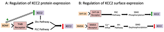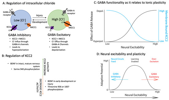 - Pozzi, D.; Rasile, M.; Corradini, I.; Matteoli, M. Environmental regulation of the chloride transporter KCC2: Switching inflammation off to switch the GABA on? Transl. Psychiatry 2020, 10, 349. [Google Scholar] [CrossRef]