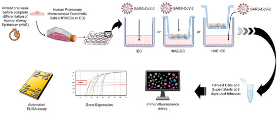 The aim of this study was to evaluate the impact of SARS-CoV-2 infection on endothelial activation/damage in a co-culture model of organotypic HAE and pulmonary ECs. Specifically, we investigated: (i) the ability of EC in sustaining SARS-CoV-2 replication (iEC vs. EC); (ii) the impact of HAE on EC-viral replication in co-culture (iEC vs. iEC/HAE); (iii) the by-stander effect of iHAE on EC damage/senescence (iHAE/EC vs. HAE/iEC).