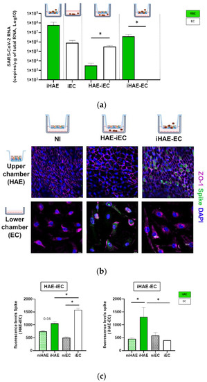 The presence of SARS-CoV-2 in ECs or in HAE during HAE-EC co-culture was also verified by immunofluorescence for the viral Spike protein and ZO-1 (Zonula occludens (ZO)-1 the tight junction protein expressed in all epithelial and endothelial cells [24]. The images and the quantitative analysis of the mean fluorescence Spike protein confirmed data of viral RNA (Figure 2b,c). Therefore, these data indicated that upon SARS-CoV-2 infection of HAE-EC co-culture, viral RNA and Spike protein of SARS-CoV-2 were detected both in ECs and in HAE, although effective viral replication was observed only in HAE.