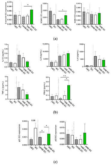 Total RNA was extracted from HAE and ECs using Direct-zol™ RNA MicroPrep KIT (from Zymo Research Corp., Irvine, CA, USA) according to the manufacturer’s instructions. For RT-PCR analysis, single-stranded cDNA was obtained by reverse transcription of one μg of total RNA using AMV-reverse transcriptase (from Promega Corporation, Madison, WI, USA). ICAM-1, VCAM-1, E-selectin, IFNβ, p21, and p53 mRNA levels were analyzed by quantitative PCR using the following primers: ICAM-1 F: 5′-CTCCAATGTGCCAGGCTTG-3′ R: 5′-CAGTGGGAAAGTGCCATCCT-3′; VCAM-1 F: 5′-TTCCCTAGAGATCCAGAAATCGAG-3′ R: 5′-CTTGCAGCTTACAGTGACAGAGC-3′; E-selectin F: 5′-TGAAGCTCCCACTGAGTCCAA-3′ R: 5′-GGTGCTAATGTCAGGAGGGAGA-3′; IFNβ F: 5′-CTTGGATTCCTACAAAGAAGCAGC-3′ R: 5′-TCCTCCTTCTGGAACTGCTGCA-3′; p21 F: 5′-TCAAAGGCCCGCTCTACATCTTCT-3′ R: 5′-TAGGAACCTCTCATTCAACCGCCT-3′; p53 F: 5′-GCCGTCCCAAGCAATGGATGATTT-3′ R: 5′-TCTGGCATTCTGGGAGCTTCATCT-3′. qPCR was performed with FastStart Essential DNA Green Master (from Roche, Basel, Switzerland) according to the manufacturer’s instructions. The expression levels were normalized to the GAPDH level (GAPDH F: 5′-GGTGGTCTCCTCTGACTTCAACA-3′, R: 5′-GTGGTCGTTGAGGGCAATG-3′) using the equation “2−ΔCt”. All qPCR reactions were performed in a Corbett 212 Rotor-gene6000 (Sydney, New South Wales, Australia) Real-Time PCR System.