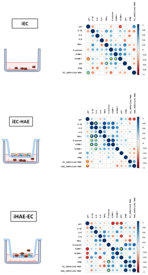 In order to define the parameters affecting the EC activation, multiple correlation analysis (viral titer, adhesion molecules, cytokines, and senescent markers) was performed in the three experimental conditions: iEC, iEC-HAE, and iHAE-EC (Figure 4).