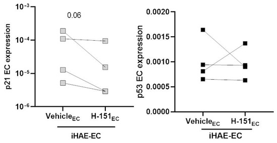 p21 and p53 ECs gene expression after H151 treatment in iHAE-EC co-culture. Gene expression analysis of p21 (left panel) and p53 (right panel) in ECs during co-culture with SARS-CoV-2 infected HAE (iHAE-EC) in the presence of H-151 (or vehicle) as indicated (n = 4). Values are presented as mean ± SEM. The Wilcoxon matched-pairs signed rank test was used for group comparison. p-value is reported in the graph.