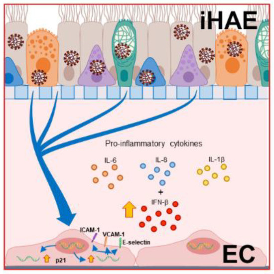 Although a small number of studies are still available, several pieces of evidence suggest that the activation of senescence processes upon infections can play both beneficial (antiviral) and detrimental (tissue injury) roles. Viral infection is able to upregulate various senescence markers, including SA-b-gal, p16, p21, and pro-inflammatory senescence-associated secretory phenotypes (SASP) molecules IL-6 and IL-8 [32,33,34,35,36]. In a recent study, Lee et al. demonstrated that virus-induced senescence may represent a pathogenic trigger of COVID-19-related organ damage [37]. Indeed, in COVID-19 patients, an increase in senescence markers in their airway mucosa and an increase in serum levels of SASP factors have been described. In this work, the SARS-CoV-2 infection of EC induced an increase in p21 expression that may promote growth arrest, thus contributing to the establishment of an antiviral profile associated with the lack of effective viral replication in EC. Moreover, when iEC were co-cultured with HAE, p21 was reduced but its expression inversely correlated with viral RNA, confirming a dangerous signal released by epithelial cells in modulating viral replication in iEC. Interestingly, infected HAE, able to effectively sustain viral replication, induced IFN-β release and EC activation that, in turn, correlated with p53, suggesting the main role of infected HAE in inducing EC damage.