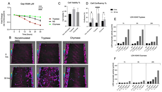 Tryptase enhances gap closure capacity whereas chymase attenuates the gap closure rate compared to nontreated cells in alveolar epithelial cells (A). Holographic images of non-stimulated, tryptase and chymase stimulated cells at 0 h and 30 h (B). Cell viability (C) and cell confluency test (D) to further evaluate potential cytotoxic effect of MC proteases. Lactate Dehydrogenase (LDH) cytotoxicity test establishes non-toxic working concentration of tryptase (E) and chymase (F) in alveolar epithelial cells. Statistical significance between non-stimulated, tryptase and chymase stimulated was tested using a two-way ANOVA with Tukey’s multiple comparison test. Data represent mean (SD), non-stimulated vs. tryptase **** p < 0.0001, tryptase vs. chymase xxxx p < 0.0001, non-stimulated vs. chymase #### p < 0.001. Data based on three technical repeats with three monitored positions in each well. For (D), * p < 0.05 cell confluency quantified at 0 h and 30 h using holographic live cell imaging **** p < 0.0001 cell confluency quantified at 0 h and 30 h post tryptase stimulation using holographic live cell imaging.