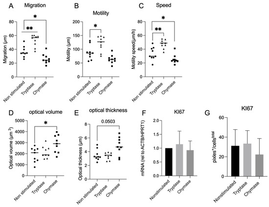 Chymase reduced and tryptase enhanced the migrated distance in µm from start point to end point (linear distance) compared to non-stimulated cells (A). Tryptase also enhanced the motility (total migrated distance in µm) compared to both chymase and non-stimulated cells (B). Tryptase increased the cellular speed (µm/h) compared to non-stimulated cells and chymase decreased the cellular speed compared to non-stimulated cells (C). Chymase stimulated cells displayed altered morphology in terms of optical volume compared to tryptase and non-stimulated cells (D) and chymase stimulated cells also displayed a trend of enriched optical thickness compared to both tryptase and non-stimulated cells (E). mRNA and protein expression of proliferation marker Ki67 did not display any significant difference between the groups (F,G). Statistical significance between non-stimulated and tryptase and non-stimulated and chymase stimulated was tested using the Mann–Whitney test. Data represent mean (SD). * p < 0.05, ** p < 0.01. Data are based on a minimum of three technical repeats.