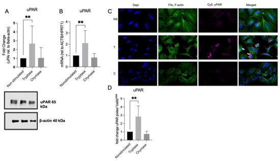 Exploring the MC protease impact of the membrane bound uPAR receptor revealed that tryptase enhances the expression of uPAR both on the protein and gene level (Figure 3A–D). Protein analysis of Western blot gels showed that tryptase stimulated cells had augmented expression of the membrane bound uPAR receptor (65 kDa) compared to nonstimulated cells (fold change: 2.10 ± 1.10, p < 0.01) (Figure 3A). Chymase stimulated cells did not display any significant change of uPAR expression compared to non-stimulated cells (fold change: 0.82 ± 0.36, p = 0.6825) (Figure 3A) on protein level. Using confocal microscopy and immunofluorescence targeting F-actin (Fitc, green) and uPAR (Cy5, purple), we aimed to investigate the expression of uPAR in relation to cytoskeleton composition. Again, we could confirm an enhanced protein expression of uPAR in the tryptase stimulated cells compared to the controls (p < 0.01) (Figure 3C,D). We could also detect a tendency of increased localization of uPAR expression in cells showing a migratory phenotype (e.g., clusters of F-actin positivity in lamellipodia) in the tryptase stimulated cells compared to non-treated and chymase stimulated cells that displayed a more even distribution of uPAR and less clustering of F-actin filaments (Figure 3C); however, we were not able to quantify this observation in an adequate manner. Further, we investigated the uPAR expression on the gene level, where tryptase (fold change: 2.10 ± 1.10 p < 0.01), but not chymase (fold change: 0.82 ± 0.36), stimulated cells displayed an upregulated expression of uPAR compared to nonstimulated cells (Figure 3B).