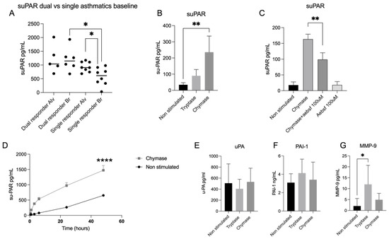 ELISA analysis revealed an increased presence of suPAR in dual responders compared to single responders and higher levels of suPAR in alveolar lavage fractions compared to bronchial BAL in single asthmatic responders (A). Chymase stimulated alveolar epithelial cells had increased levels of suPAR compared to non-stimulated cells (B) and the chymase effect was confirmed using AEBSF serine protease inhibitor (C). The increased liberation of suPAR remained over time (48 h) in chymase stimulated cells compared to non-stimulated cells (D). There was no statistical difference between any of the groups regarding the supernatant content of uPA (E) or PAI-1 (F). Tryptase stimulated cells had a higher protein expression of MMP-9 compared to non-stimulated cells (G). Statistical significance between non-stimulated and chymase stimulated cells at different time points was tested using two-way ANOVA with Šidák’s multiple comparison test. Statistical significance between non-stimulated and tryptase stimulated cells and nonstimulated and chymase stimulated cells was tested using the Mann–Whitney test. Data represent the mean (SD) and are based on 5 technical repeats. * p < 0.05, ** p < 0.01, **** p < 0.0001. For dual responders alveolar fraction n = 5, dual responders bronchial fraction n = 6 and single responders alveolar and bronchial fractions n = 8. Br = Bronchial fraction. Alv = Alveolar fraction.