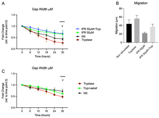 Live cell imaging revealed impaired gap closure (A) and migration (B) with the addition of uPA-uPAR inhibitor compared to non treated cells. The gap closure promoting effect of tryptase was reduced with the use of serine protease inhibitor AEBSF (C). Statistical significance between non-stimulated and chymase stimulated cells at different time points was tested using two-way ANOVA with Šidák’s multiple comparison test. Statistical significance between non-stimulated and tryptase stimulated cells and nonstimulated and chymase stimulated cells was tested using the Mann–Whitney test. Data represent mean (SD) and are based on 3 positions in one technical repeat. Nonstimulated vs. IPR # p < 0.05 tryptase vs. tryptase IPR + tryptase **** p < 0.0001. Nonstimulated vs. Tryptase # p < 0.05, tryptase vs. AEBSF + Tryptase **** p < 0.0001.