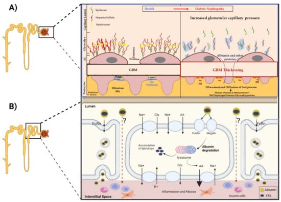 - Under normal conditions, GFB prevents leakage of high-molecular-weight proteins, including albumin, into Bowman’s space. Destruction of any of the layers of the GFB in the diabetic kidney might result in proteinuric disease. This may be initiated by promoting increased production of reactive oxygen species (ROS), the induction of AGE-induced proinflammatory signaling and increased glomerular capillary pressure and hyperfiltration. Damage to all three components of GFB in the diabetic kidney is evident by endothelial dysfunction (ED), disrupted glomerular basement membrane (GBM) with increased deposition of extracellular matrix, loss of podocyte permselectivity and progressive podocyte damage: (1) ED is characterized by structural and functional damage to the glycocalyx, and its components, especially heparan sulfate (HS), are released and appear in the urine. Indeed, derangement of the glycocalyx plays a pivotal role in the development of albuminuria secondary to enhanced vessel wall permeability with protein leak. (2) One of the milestone features of DN is thickening of GBM along with the development of proteinuria. (3) Similarly, podocyte damage is considered a crucial step in the pathogenesis of proteinuric kidney diseases, including DN. Specifically, effacement and effusion of podocyte foot processes are a hallmark feature of ultrastructural alterations characterizing proteinuric renal disease, including DN.