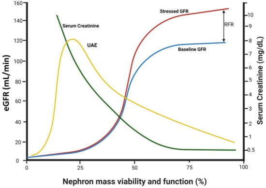 Protein ingestion is associated with an abrupt increment in GFR, a response that can be replicated by intravenous infusion of amino acids, such as glycine or alanine. This rise in GFR above baseline following protein load is referred to as renal functional reserve (RFR) [51]. It reflects the ability to enhance single-nephron GFR, likely by means of an increase in trans-glomerular pressure and/or ultrafiltration coefficient. RFR of intact nephrons may compensate, to a certain extent, for transient or permanent functional dropout of nephrons, maintaining near-normal levels of creatinine levels during a moderate decline in renal functional mass. Overall renal function may remain preserved at that range of moderate dropout of functioning nephrons, which can be acute and transient, or progressive and permanent, thanks to the activation of single-nephron functional reserve. In fact, clinical observations regarding acute changes in kidney function indicate that RFR may serve as a “shock absorber”, concealing “subclinical” AKI and recovery from AKI [52,53]. However, as shown in Figure 4, RFR diminishes as renal functional mass declines, likely since remnant nephrons activate their functional reserve to the maximum. As RFR diminished with advanced CKD, creatinine increments become steeper, and acute renal injury can no longer be masked by the buffering impact of RFR. This may explain the predisposition to AKI among diabetic and non-diabetic patients with advanced CKD, such as in the case of contrast nephropathy [40].
