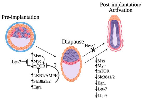 The activities of several transcription factors (Myc, Msx, and EGR1) change upon the induction of diapause, and the expression levels of the glutamine transporters Slc38a1/2 are upregulated. Increased expression of glutamine transporters is also required for embryos to remain in the diapause stage, as chemical and genetic inhibition of these transporters results in the exit from the diapause stage [24]. Furthermore, the microRNA let-7 was also shown to inhibit the transcription factor Myc. The depletion of Myc causes the embryo to enter diapause and is associated with the downregulation of biosynthetic pathways in diapause. Another transcription factor that is essential for normal embryonic diapause is Hesx1. Mutations in Hesx1 result in the failure of embryos to continue embryonic development after implantation.