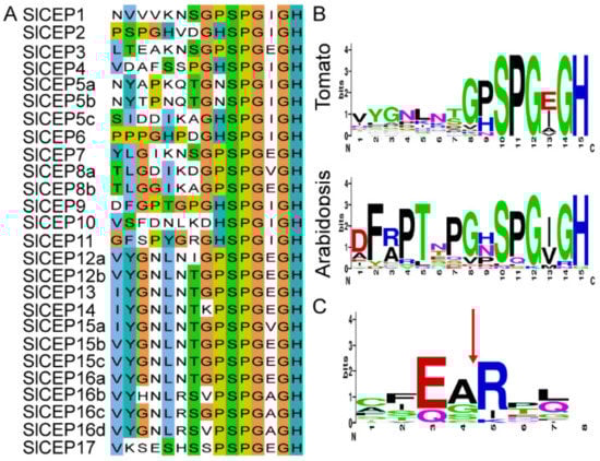 The AtCEP proteins contain one or more conserved CEP motifs at the C-terminus [,]. Therefore, we analyzed the presence and distribution of CEP motifs in the 17 SlCEP proteins. Our analysis showed that SlCEP8 and SlCEP12 contained two CEP domains; SlCEP5 and SlCEP15 displayed three CEP domains; SlCEP16 showed four CEP motifs (Figure 1A; Table S1). Notably, some SlCEP proteins shared identical CEP motifs (Figure 1A). The N-terminal signal peptide proteolytic processing is essential for generating mature and functional CEP peptides [,]; we next searched for the presence and location of the putative N-terminal signal peptide cleavage sites in each SlCEP proteins. Based on the prediction, it is likely that the cleavage site occurs at a conserved arginine site (Figure 1C; Table S2), which has been also shown in CEP proteins identified in other plant species [,,]. However, we did not find any cleavage site for SlCEP12; this may be due to the limitations of the software.