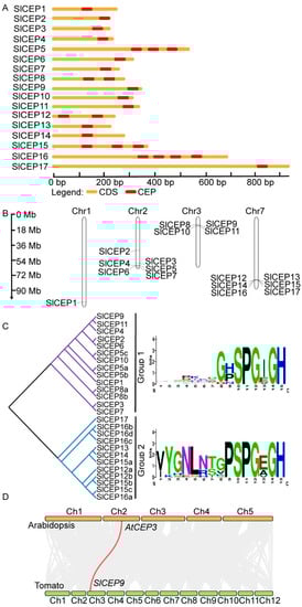 Genomic organization and chromosome localization, and phylogenetic analysis of SlCEP genes. (A) Gene structure of SlCEP genes. (B) Distribution of SlCEP genes on tomato chromosomes. (C) SlCEP proteins are classified into two major groups based on the CEP motifs. Weblogo showing the consensus sequence of CEP motifs in each subgroup. The phylogenetic tree was generated based on the CEP motifs of SlCEP proteins with 1000 bootstrap replicates. (D) The gene duplication analysis of the CEP genes of A. thaliana with S. lycopersicum. The gray lines (in the background) represent collinear blocks between the respective genomes. The red lines indicate the syntenic gene pairs of S. lycopersicum with A. thaliana.