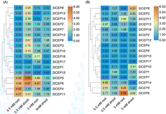 SlCEP genes expression are differentially regulated by nitrogen status in tomato roots and shoots. Expression levels of SlCEP genes in roots and shoots were quantified under low (0.5 mM) and high (5 mM) nitrate (A) and ammonium (B) treatment for 72 h. Relative expression levels of the genes were normalized to normal nitrogen condition, and the color represents log2 values. The heatmap was generated by TBtools.