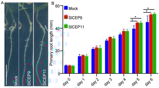 Next, we synthesized SlCEP9 and SlCEP11 peptides, the most identical CEP peptides to known function of AtCEP (Figure 2D and Figure S1), as examples to verify the physiological function of SlCEP peptides in tomato root development. After germination, tomato seedlings with a similar primary root length were transferred to new plates supplied with the synthetic SlCEP peptides and were cultured for another 6 days. Under our experimental conditions, we observed that tomato seedlings treated with both SlCEP9 and SlCEP11 peptide showed a significantly longer primary root (Figure 4).