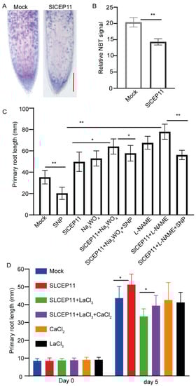 It has been reported that the inhibition of NO could promote tomato root growth [,,]; we then focused on the involvement of NO in SlCEP11-mediated tomato root growth. NO can be oxidized to NO2, and superoxide can be detected by NBT staining; hence, we performed NBT staining as an indirect indication of NO level in SlCEP11 peptide-treated tomato primary roots. Our staining result revealed that SlCEP11 peptide significantly reduced the superoxide level compared to control treatment (Figure 5A,B), suggesting a potential reduced NO level triggered by the SlCEP11 peptide. We next assessed the effect of NO inhibitors on SlCEP11 peptide-mediated root growth. In line with previous reports [,,], tomato primary root growth was promoted when NO signaling was inhibited and SNP (a NO donor) repressed the primary root growth. However, SlCEP11 and NO inhibitor exhibited a synergistic effect on primary root growth (Figure 5C). When exogenous NO was supplied, the synergistic effect was partially abolished, suggesting that NO is involved in SlCEP11 peptide function (Figure 5C). Ca2+ is an important signaling for plant development []; we then addressed whether Ca2+ participates in SlCEP11-mediated root growth. When the calcium channel was blocked by LaCl3, root growth promotion triggered by the SlCEP11 peptide was also counteracted (Figure 5D), and exogenous Ca2+ partially suppressed the LaCl3 effect. These data indicate an involvement of calcium signaling in SlCEP11-mediated root growth. Taken together, these preliminary data showed that NO and Ca2+ were involved in SlCEP peptide function in tomato root development.