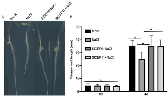 The CEP peptide has also been suggested to play roles in stress response [,,]. The atcep3 mutant displayed resistance to slat stress []; hence, we investigated whether the synthetic SlCEP9 and SlCEP11 peptides play a role in salinity response. After germination, tomato seedlings with a similar primary root length were transferred to new plates supplied with the synthetic SlCEP peptides in the presence of 100 mM NaCl and were cultured for another 4 days. Under our experimental conditions, we observed that salinity stress greatly inhibited tomato primary root growth; however, tomato seedlings treated with synthetic SlCEP peptides displayed longer primary roots, implying that SlCEP pep could improve tomato fitness under salt stress (Figure 6).
