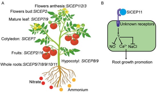 Summary of our work. (A) Expression pattern of SlCEPs in tomato tissues based on the public RNA-seq data. SlCEPs were also differentially regulated by nitrate and ammonium in roots and shoots, respectively. (B) A proposed working module for SlCEP11 peptide in tomato root development. SlCEP11 was perceived by unknown receptors, then regulated an undefined player to modulate NO, Ca2+ and salinity signaling, ultimately leading to root growth promotion.