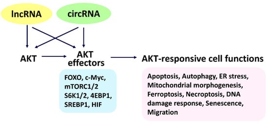This review provides an overview of AKT, AKT effectors, lncRNAs, and circRNAs in regulating cell functions (Figure 1). Firstly, it summarizes detailed information on AKT and AKT signaling-modulated functions relating lncRNAs and circRNAs to several cell functions, especially for cancer cells, including apoptosis, autophagy, ER stress, mitochondrial morphogenesis, ferroptosis, necroptosis, DNA damage response, senescence, and migration. Detailed mechanisms for most lncRNA- and circRNA-associated regulation of AKT and AKT effectors lack in-depth connection. To fill the gap, we next chose databases for lncRNAs and circRNAs that provide the predicted targets to AKT and AKT effectors (Section 2 and Section 3). Subsequently, these predicted targets (AKT and AKT effectors) of lncRNAs and circRNAs are connected to cell functions by a literature survey. Finally, AKT and AKT effectors that regulate cell functions appear to be well organized and connected to lncRNAs and circRNAs.