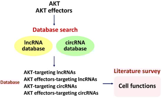Strategy for connecting database-predicted AKT-, AKT effector-targeting lncRNAs and circRNAs to their regulating cell functions. By searching LncTarD [] and circBase [], these AKT- and AKT effector-targeting lncRNA and circRNA candidates were retrieved by individual input of gene names for AKT1, AKT2, and AKT3, as well as AKT effectors. Subsequently, they were applied to a literature survey by Google Scholar and PubMed to check their potential cell functions.