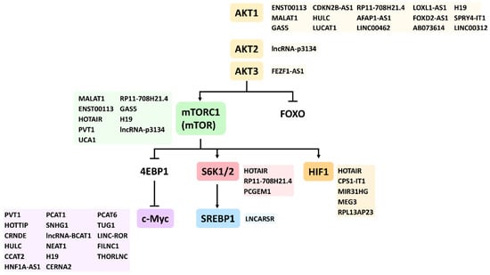 Since AKT1, AKT2, and AKT3 are encoded by different genes, their related modulating lncRNAs are different as well. This lncRNA target information for AKT1, AKT2, and AKT3 was retrieved from the LncTarD database [] and summarized in Table 1). Several lncRNAs (ENST00113, MALAT1, CDKN2B-AS1, HULC, LUCAT1, AFAP1-AS1, LINC00462, LOXL1-AS1, AB073614, H19, and SPRY4-IT1) upregulate AKT1, while some lncRNAs (GAS5, RP11-708H21.4, FOXD2-AS1, and LINC00312) downregulate AKT1. LncRNA (lncRNA-p3134) upregulates AKT2, and lncRNA (FEZF1-AS1) upregulates AKT3.