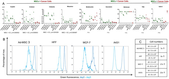 Investigation of drug sensitivity and proliferation rate of MSCs and cancer cells. (A) IC50 values (µM) of nine different compounds measured in 6 MSCs and 3 cancer cell lines. Results expressed as a mean of at least 3 repeated experiments with standard deviation. (B) Ad-MSC 3, HFF, MCF-7, and A431 cell lines’ proliferation rates were compared using the CytoTell Green dye. Dark blue represents the fluorescent signal at day 0 and light blue at day 5. Larger gap between the two curves means greater proliferation. (C) Cell numbers were counted at days 0 and 5.