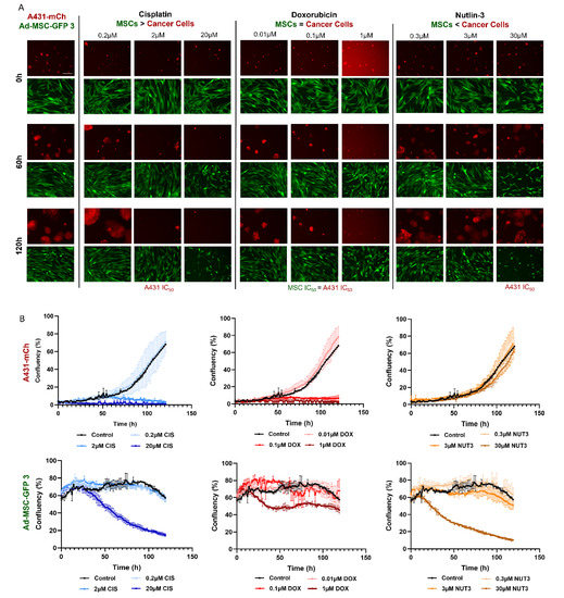 A 120-h live cell imaging was also conducted to visually confirm the effects of compounds on different cell types using mCherry expressing A431-mCh cancer cells and Ad-MSC-GFP 3 MSC cultures (Figure 2). Three drugs were selected for the experiments based on the selective toxicity either to cancer cells (cisplatin), to MSCs (nutlin-3), or showing similar efficiency against both (doxorubicin). As the aim of chemotherapy is to kill cancer cells, we used concentrations equal to A431-mCh’s IC50 values with two additional, 10-fold lower and higher doses. A431-mCh cells responded to drugs as expected, while the lower concentrations of cisplatin and doxorubicin did not alter growth kinetics compared to untreated controls, both IC50 and higher concentrations of the drugs significantly reduced the number of viable colonies. Since nutlin-3 was engineered to target only p53 wild-type cells, the drug had no effect on p53 mutant A431-mCh cultures in either concentration. Interestingly, despite cytotoxicity results suggesting that MSCs and cancer cells share remarkably similar sensitivity to doxorubicin, no significant decrease was observed in Ad-MSC-GFP 3 cultures after 120 h of treatment. Significant drops in confluency were only seen at concentrations of 2-fold of cisplatin and 3-fold of nutlin-3 IC50 values found on Ad-MSC-GFP 3. This outcome suggests that MSCs, rather than dying off after treatment, choose a different path, such as cell cycle arrest, senescence, or differentiation, and can only be killed with significantly higher concentrations than the IC50 observed in a cytotoxicity assay.