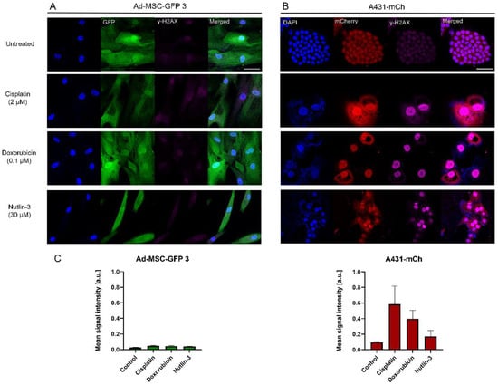As it seems, MSCs can also be affected by chemotherapeutics despite possessing a significantly lower proliferation rate compared to cancer cells, but intriguingly avoiding cell death in some way. To further examine the response of cancer cells and MSCs to drugs, DNA damage was investigated. DNA double-stranded breaks in the nuclei of treated cells were detected using phosphorylated γ-H2AX staining. Cisplatin, doxorubicin, and nutlin-3 can directly or indirectly cause DNA-damage in cells, therefore, we investigated DNA-damage in the same two cell lines as above and optimized the treatment conditions according to A431-mCh cells’ IC50 values. Important differences were found in the two cell lines (Figure 3A,B). All 3 drugs caused massive DNA damage in A431-mCh cells (Figure 3B), even nutlin-3, which, according to the live cell imaging experiments, did not reduce cell number after 120 h of treatment. In contrast, no DNA break was detected in Ad-MSC-GFP 3 cells, not even after nutlin-3 treatment, despite both cytotoxicity and video microscopy experiments showing significantly decreased viability at 3-fold IC50 concentrations (30 µM). Increasing cisplatin concentration to 10 µM (IC50 concentration of Ad-MSC-GFP3 cells) significantly increased the number of double-stranded breaks in MSCs, while almost completely eradicating A431 cells (Supplementary Figure S3A).