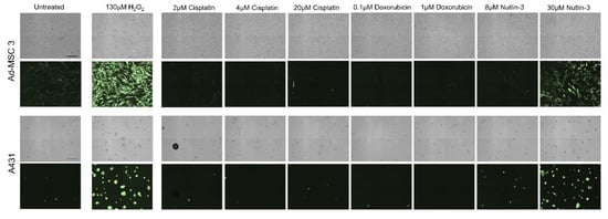 Not only is the increased metabolic rate able to induce large amounts of cytotoxic ROS in cancer cells, but several anticancer agents can also generate ROS via the electron transport chain. This induced oxidative stress can damage the cells and lead to ROS-mediated cell death in cancer cells and MSCs. As differences in DNA damage cannot explain the contrast in drug response between cancer cells and MSCs, reactive oxygen species (ROS)-related cell death mechanisms were also examined. Cells were treated with cisplatin, doxorubicin, and nutlin-3 at different concentrations for 1 h to elucidate ROS induction after treatment (Figure 4). Cisplatin and doxorubicin did not induce ROS, even when cells were treated with higher concentrations. Strikingly, 30 µM of nutlin-3 generated a considerable amount of ROS in both Ad-MSC 3 and A431 cells, resulting in an almost similar increase as 130 µM of the H2O2 control treatment. According to live cell imaging, 30 µM of nutlin-3 was more toxic to Ad-MSC-GFP 3 than A431, suggesting that cancer cells can possibly manage ROS-related damage more efficiently.