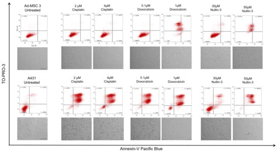 Apoptosis detection was based on the Annexin-V molecule binding to phosphatidylserine membrane molecules. Two cell lines were used to study apoptosis: Ad-MSC 3 cells were plated in a 5 × 104 cells/well concentration, while 4 × 104/well A431-mCh were seeded into each well in a 12-well tissue culture plate. Cells were incubated overnight, and treated with cisplatin, doxorubicin, and nutlin-3 at the indicated concentrations in 1 mL of culture media. At day 5, cells were trypsinized and centrifuged, while the supernatant was also collected and combined with the detached cells to include all already dead cells. Cells were washed twice with 500 µL of 1% BSA-PBS (bovine serum albumin dissolved in PBS, A8022, Sigma-Aldrich, St. Louis, MO, USA) solution and centrifuged at 400× G for 4 min. Cells were resuspended in 100 µL of 1× Annexin Binding Buffer (422201, Biolegend, San Diego, CA, USA), and 3 µL of Annexin V-Pacific Blue (A35122, Biolegend, San Diego, CA, USA) and 1 µL of TO-PRO-3 (R37170, Invitrogen, Waltham, MA, USA) were added to each sample. After 15 min of incubation, labeled and non-labeled samples were diluted 5-fold with 1× Annexin Binding Buffer and analyzed by Attune™ NxT flow cytometer.