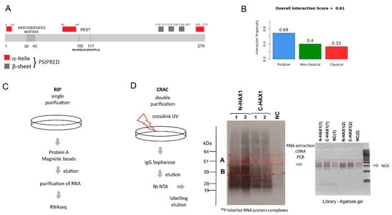 Experimental design of HAX1–RNA interactome studies. (A) HAX1 amino acid sequence with characteristic features and regions (acid box, PEST domain, structural elements predicted using PSIPRED (PSI-blast-based secondary structure PREDiction)). (B) CatRapid prediction of HAX1 RNA binding propensity classifies it as a putative RBP, but binding does not occur via classical elements. (C) Schematic of RIP experiments: no crosslink, single purification step with HAX1-specific antibody. (D) Schematic of CRAC experiments, sequential steps: UV crosslink of RNA targets, double purification with Sepharose and NiNTA resin, isotope labeling and extraction of the RNA–protein complexes from polyacrylamide gel, RNA extraction, reverse transcription, PCR, and next generation sequencing of the RNA targets.