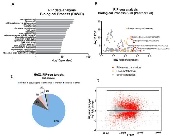 Identification of HAX1-associated RNA targets by RIP-seq analysis in HL-60 cells. (A) Functional annotation enrichment of HAX1 target genes. Enriched gene ontology terms (DAVID: Biological Process) presented in bar plot, the length of each bar corresponds to statistical significance of the enrichment (−log10 p-value). The top twenty terms are presented. (B) Enriched Biological Process terms (Panther GO) plotted with fold enrichment (log2) against False Discovery Rate (−log10). The most reliable results are in the upper right corner. Categories associated with ribosome biogenesis, rRNA processing, and translation are marked red. Categories associated with RNA metabolism (other than rRNA) are marked light orange. Detailed description of GO terms in Supplementary File S1. (C) Distribution of RNA classes among HAX1 RIP targets. (D) MA plot showing RIP targets counts (X-axis) calculated as fragments per kilobase per million (FPKM); Y-axis: log2FC(RIP_HAX1/RIP_IgG), red—significant, grey—not significant. The internal frame indicates positive log2 FC (physiologically relevant as possible binding targets).